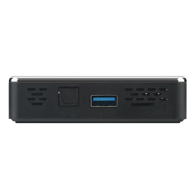 На корпусе приставки расположены такие порты и разъемы, как USB 3.0, USB 2.0, HDMI 2.0, слот для карты памяти MicroSD, а также Type-C для подключения питания. Беспроводные интерфейсы представлены двухдиапазонным Wi-Fi b/g/n/ac 2.4 / 5.8 Ггц и Bluetooth.